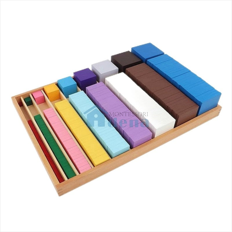 The Cubing Material is used to construct cubes and discover relationships between their component parts. These exercises prepare the child for abstract analysis of the binomial and trinomial cubes along with cube roots. The material consists of 1 cube and 27 squares for each of the numbers from 1–9. Includes a beechwood tray.