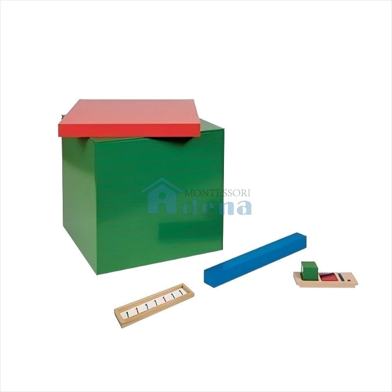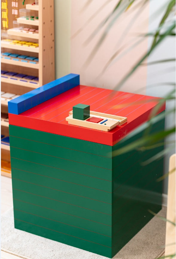 This material is used to represent in geometric form the hierarchy of number for: 1, 10, 100, 1000, 10,000, 100,000 and 1,000,000. The precise nature of these materials makes it possible to compare by size the decimal categories, visualize through the color-coded system the concept of decimal value and the families of number. A wooden tray for presentation of 1, 10, 100 and 1000 is included. Symbols card is included.
