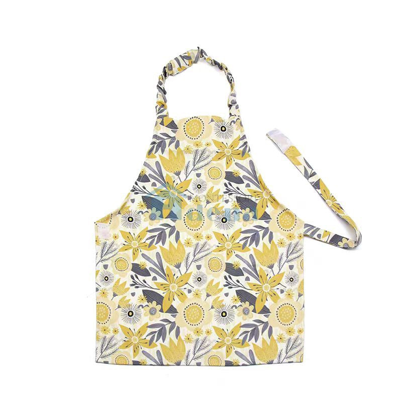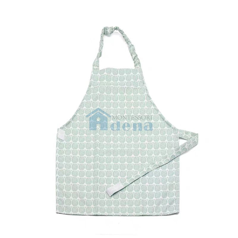 The apron measures around 21.3"*17.7" (54cm*45cm). The size is suitable for children from 2.5-6 years+. There is in front with a Velcro tab belt that's easy enough for children to manage all by themselves.