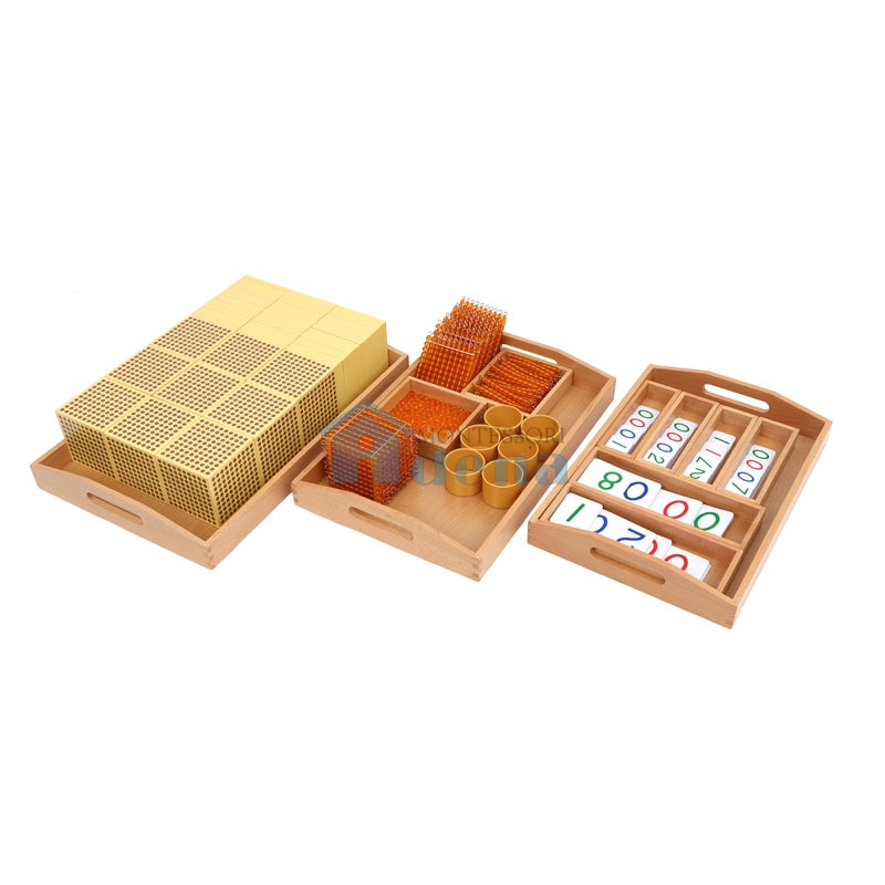 3 trays, 9 wooden pieces, 1 golden bead pieces, 45 pieces of wood pieces, 10 pieces of golden beads, 45 pieces of golden beads (packed in a wooden box), 100 pieces of golden beads (packed) In a wooden box), 6 golden cups, two sets of 1-9000 PVC cards with pallets, and four sets of PVC small cards 1-9000 with pallets. |