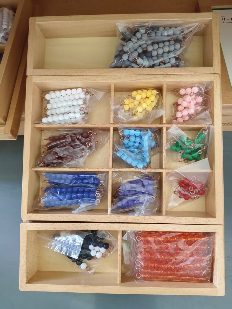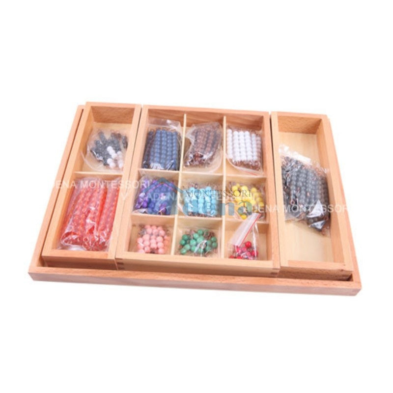 A wooden tray contains : 1) ten bars of each colored bead bars 1-9 in a wooden compartment box; 2) 5 bars of each of the grey bead bars 1-9 in a wooden box; 3) black and white bead stairs 1-9, plus 20 golden bead bards of 10 in a wooden compartment box.